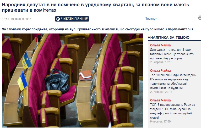 Наприклад, у новині «Народних депутатів не помічено в урядовому кварталі, за планом вони мають працювати в комітетах», де журналіст звинуватив депутатів у відсутності на робочих місця в комітетах, не була представлена точка зору депутатів. До того ж, йшлося лише про комітети, що знаходяться на вулиці Липській - проте не всі комітети знаходяться на цій вулиці, приміром Комітет ВР з питань інформаційної політики та захисту свободи слова знаходиться в готелі Київ.