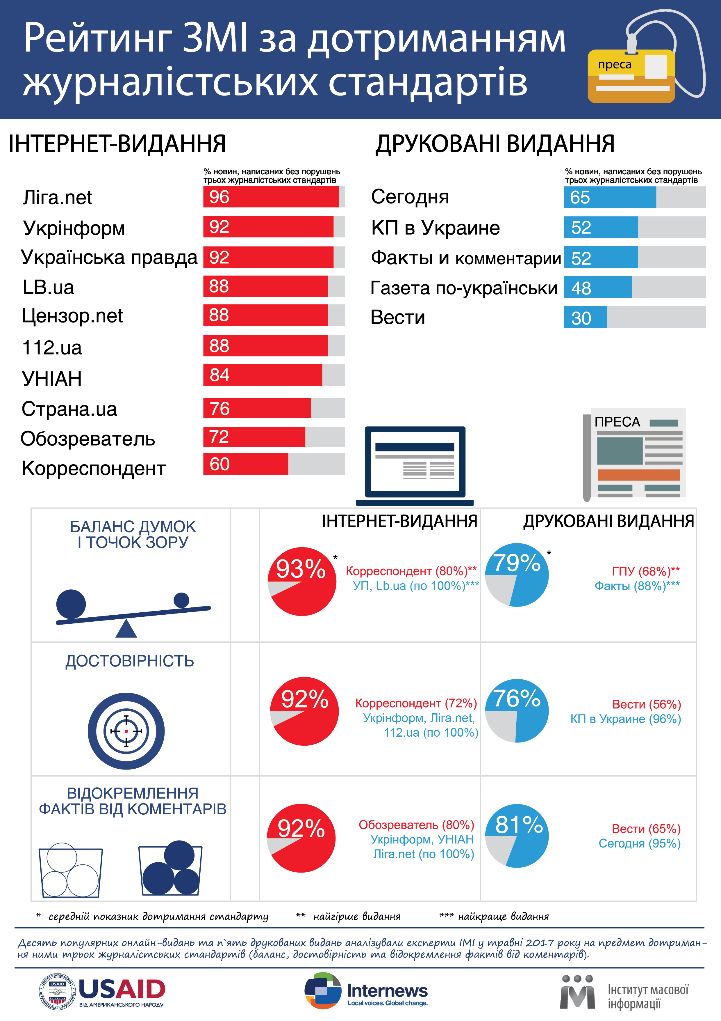 Такими є результати дослідження ІМІ на предмет дотримання ключових професійних журналістських стандартів у 10 інтернет-виданнях («Українська правда», «Ліга», УНІАН, Укрінформ, «Корреспондент», 112 канал, LB.ua, «Страна.ua», «Обозреватель» і «Цензор.нет») та 5 друкованих виданнях («Вести», «Сегодня», «КП в Украине», «Факты и комментарии» та «Газета по-українськи» (ГПУ)), що проводиться  за підтримки Інтерньюз Нетворк.