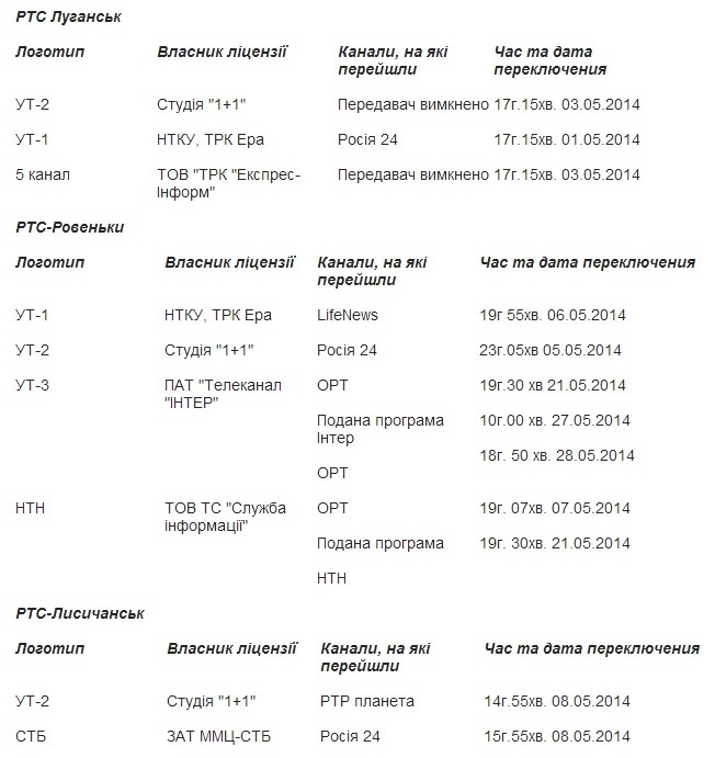 Нижче наведені дані по стану трансляції українських телеканалів у Луганську, Ровеньках та Лисичанську. Канали "ЛОТ" та "ІРТА" замінили "Россия24" і "LifeNews", відповідно, по всій Луганській області.