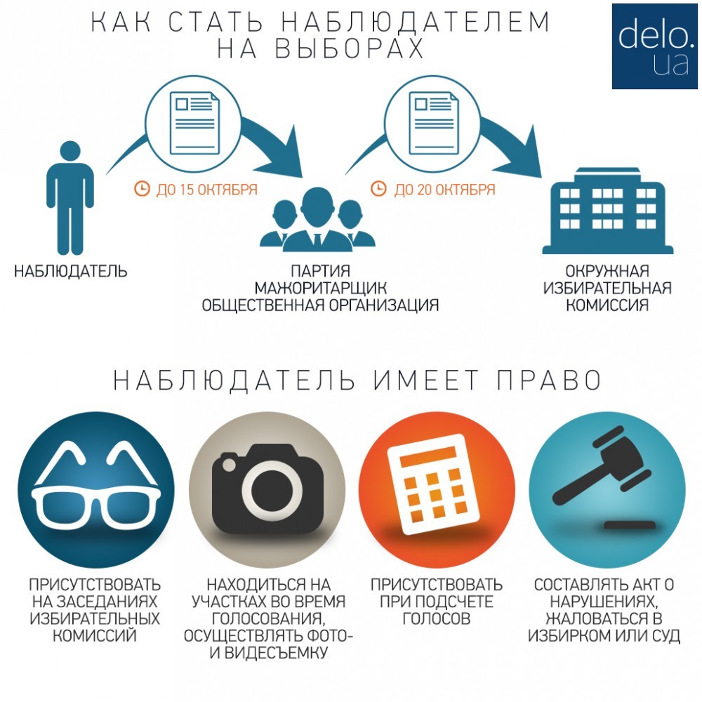 Потом, не позже чем за 5 дней до голосования (до 20 октября), руководитель общественной организации/представитель партии вносит представление в определенную окружную избирательную комиссию (ОИК) о регистрации их наблюдателя на данном округе. В этом году Центризбирком разрешил выдвигать наблюдателей 37 гражданским организациям (полный список здесь), самые известные из которых — ОПОРА и Комитет избирателей Украины. Присутствуют также гражданские организации от партий "УДАР", "Фронт перемен", "Заступ". Эксперты указывают, что первым тестом на серьезность организации является наличие сайта. "Если нет контактов организации в интернете, то скорее всего она в действительности не существует или ее искусственно зарегистрировали, чтобы потом использовать в своих политических интересах", — рассказал Delo.UA зам главы КИУ Виталий Тесленко.