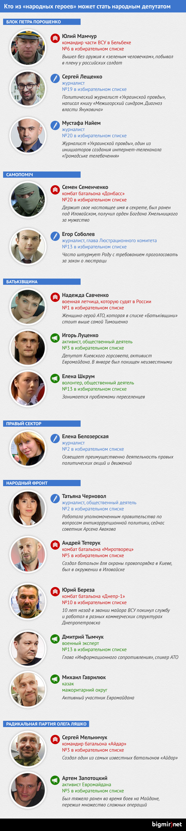 Если на предыдущих выборах в Раду партии ставили на артистов, то на сей раз в каждой из политических сил есть так называемый народный герой – участник АТО, активист Евромайдана и даже журналисты.
