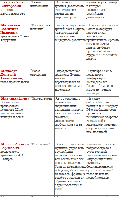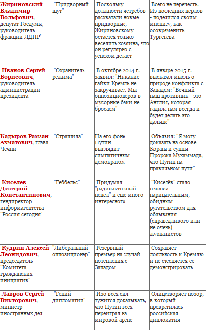 Депутат Госдумы, руководитель фракции ЛДПР Владимир Жириновский долгое время лепил себе имидж "ястреба" и тихо радовался, когда СМИ в очередной раз рассказывали, мол, "что у Путина на уме, то у Жириновского на языке". Однако за последние годы должности "ястребов" расхватали новые придворные, а Жириновскому остается только веселить хозяина, что он регулярно с успехом делает. Например, в декабре прошлого года на совместном заседании Госсовета РФ и Совета по культуре и искусству, Жириновский посоветовал осовременить классические произведения российской литературы. "Барыня - главная героиня "Муму", - поведал Жириновский. - А миллионы школьников считают, что герои - собачка или глухонемой дворник! Осовременить нужно. Кто эта дама будет? Васильева, которая по делу Минобороны проходит. А на роль глухого Герасима какого-то мигранта взять из Средней Азии, Муму найти. И этот спектакль вызовет какой-то интерес". А еще он посоветовал Путину прибегать к репрессиям против инакомыслящих: "Достоевский почему стал великим писателем? 10 лет каторги! Какой вывод я делаю? Надо сажать!".