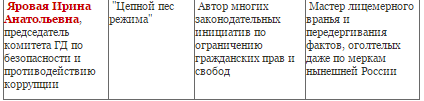 Депутат Госдумы, председатель комитета по безопасности и противодействию коррупции, хрупкая блондинка, замужем, мать двоих детей Ирина Яровая играет в архитектуре власти роль еще более противоестественную, чем, скажем, "прокурор Крыма" "Няша" Полонская, когда дает сроки активистам крымскотатарского движения. Яровая - автор большинства законодательных инициатив последних лет по ограничению гражданских прав и свобод, а также о том, как наказывать всевозможных нарушителей упомянутых ограничений. Уголовная ответственность за клевету; уголовная ответственность за действия, оскорбляющие чувства верующих; уголовная ответственность за распространение заведомо ложных сведений о деятельности армий стран антигитлеровской коалиции во время Второй мировой войны; введение во всех школах единого государственного учебника истории с целью патриотического воспитания детей; начисление и выплата пенсий гражданам, которые на постоянной основе сотрудничают с правоохранительными органами, - это далеко не полный перечень предложений, многие из которых уже стали законами. Яровую можно назвать признанным мастером лицемерного вранья и передергивания фактов, оголтелых даже по меркам нынешней России. Из последних цитат (комментарий к появившимся в соцсетях фотографиям куч выброшенных фотографий с изображением участников ВОВ после действа "Бессмертный полк"): "Главная ошибка, которую совершают провокаторы и недруги России, во все времена одна и та же - неспособность понять духовные и нравственные истоки и силу нашего народа".