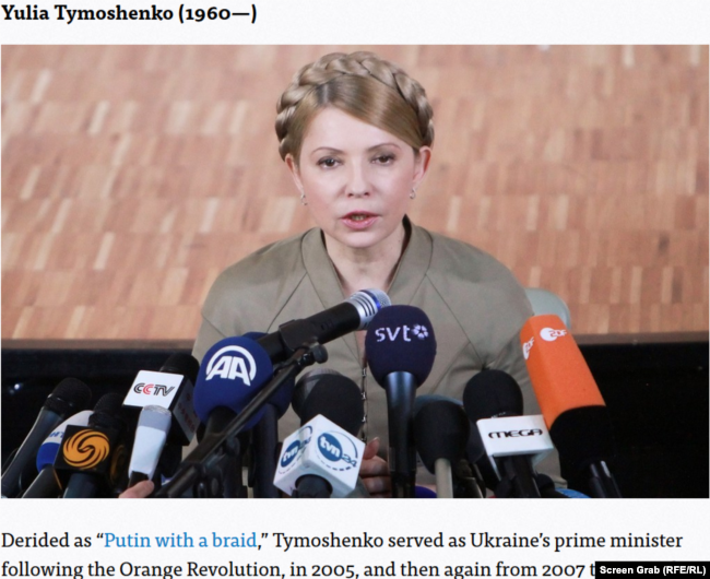 В розділі, присвяченому Юлії Тимошенко, Politico.eu називає її «Путіним з косою» і перераховує її газовий бізнес, суперечки з Ющенком і марнування здобутків Помаранчевої революції і засудження її на 7 років владою Януковича, що «усунуло її з політичного небосхилу».
