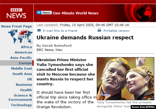 А вже 15 квітня 2005 року ВВС написала, що Юлія Тимошенко скасувала свій візит до Москви, «вимагаючи поваги Росії до України».