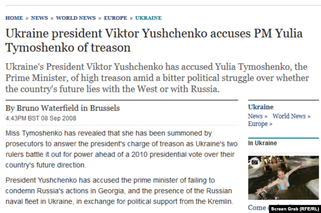 Британська газета The Daily Telegraph 8 вересня 2008 року вмістила статтю під заголовком: «Український президент Віктор Ющенко звинувачує прем’єра Юлію Тимошенко у зраді», а в підзаголовку вказує, що це сталося на тлі «запеклої боротьби щодо того, чи майбутнє країни лежить із Заходом чи з Росією».