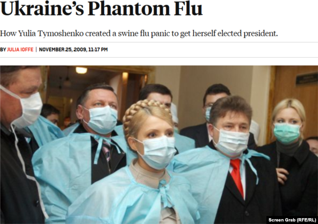 «Але реакція України на вірус досягла нового рівня явної політизації. Згідно з виборчим радником Юлії Тимошенко, український прем’єр та президентський кандидат свідомо роздмухувала страх щодо триваючої епідемії свинячого грипу щоби допомогти собі в президентських перегонах».