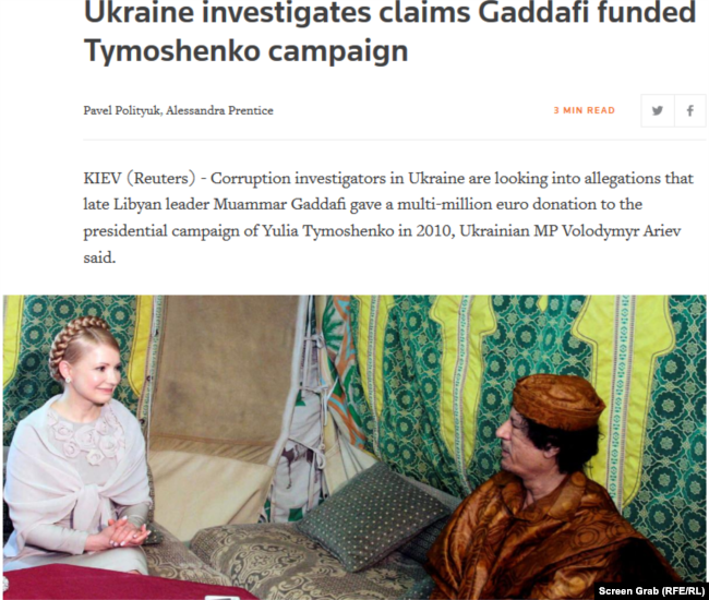 5 квітня 2018 року міжнародне агентство Reuters опублікувало матеріал під назвою: «Україна розслідує твердження, що Каддафі фінансував кампанію Тимошенко».
