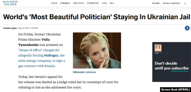 Серпень 2011 року – велика кількість публікацій на тему ув’язнення Тимошенко. Стаття на сайті Business Insider має заголовок: «Найкрасивіший політик» світу перебуває в українській в’язниці».