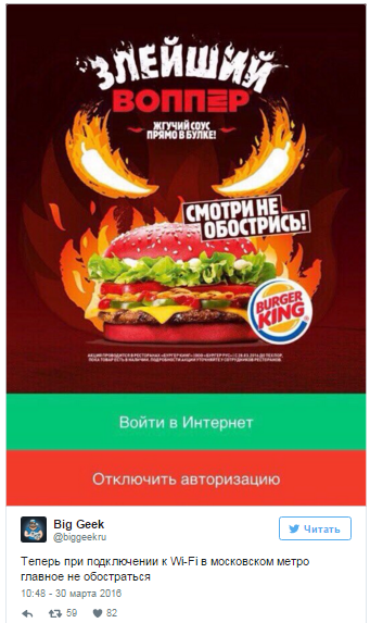 Реклама нового острого бургера от Burger King демонстрировалась при подключении к Wi-Fi в московском метро, а также в официальных сообществах сети ресторанов в соцсетях. Позже двусмысленный слоган «Смотри не обострись!» заменили на «Остро!», сейчас в официальных сообществах остались только картинки с отредактированной версией рекламы.