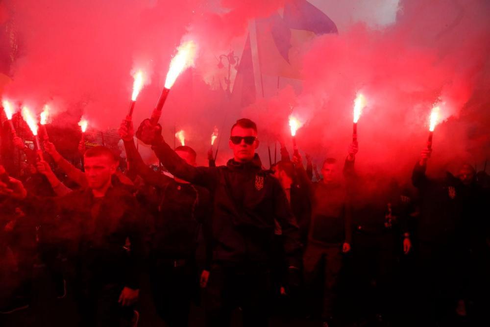 Тысячи ультраправых активистов и участников националистических движений вышли в понедельник в центр Киева, размахивая зажженными файерами и выкрикивая «Слава Украине!», сообщает Associated Press.