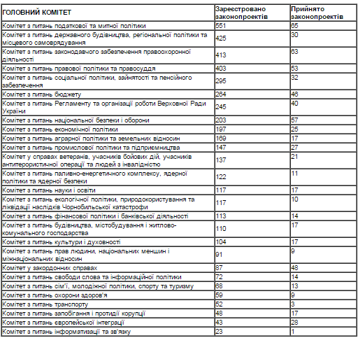 Отже найбільш завантаженими законотворчістю протягом першого року роботи Верховної Ради були чотири комітети – Комітет з питань податкової та митної політики, Комітет з питань державного будівництва, регіональної політики та місцевого самоврядування, Комітет з питань законодавчого забезпечення правоохоронної діяльності і Комітет з питань правової політики та правосуддя. Тоді як найменше роботи з розгляду та удосконалення законопроектів у депутатів, що входять до Комітету з питань інформатизації та зв'язку, Комітету з питань європейської інтеграції (43 законопроекти) і Комітету з питань запобігання і протидії корупції (48 законопроектів).