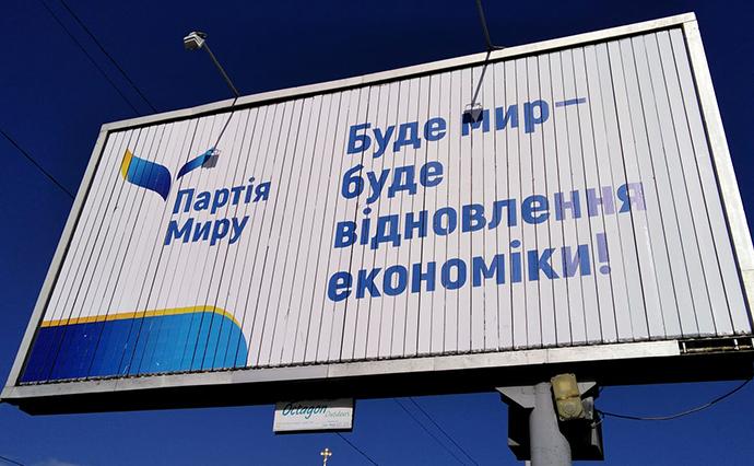Представники руху зачепили болісну для українців тему. Основна риторика – досягнення миру і всі похідні від нього. Мир – це робочі місця, безпека на вулицях, щасливе майбутнє. З такими гаслами "Партія миру" вийшла цьогоріч на білборди.