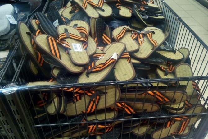 В конце апреля в подмосковном Королеве из продажи в авральном порядке изъяли партию мужских вьетнамок, сработанных из георгиевских лент. Перед этим «патриотическая» обувь пару недель пролежала на прилавках, а фотографии товара собирали гневные комментарии в соцсетях.