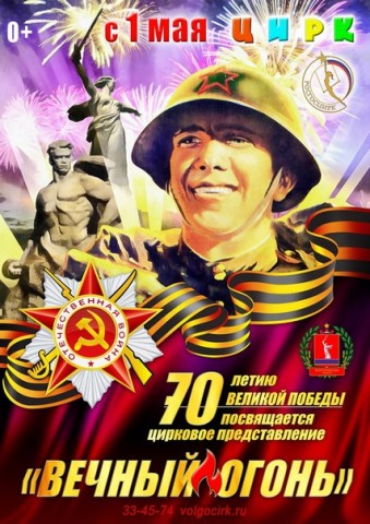 А в Волгограде с 1 по 11 мая цирк дает представление «Вечный огонь». 70-летию Великой Победы посвящается, дети до пяти лет бесплатно. Читаем афишу: «В программе будут задействованы самые последние новинки техники в области лазерного освещения, проекторы для транслирования документальных сьемок времен Великой Отечественной Войны, а также используются тематические декорации для полного погружения зрителя в происходящее. Жонглеры, акробаты, верховые, наездник и многое другое ожидает зрителя на манеже Волгоградского Цирка. Все это станет уникальным событием в культурной истории РФ». То есть циркачи не шутят, а предлагают свой «Вечный огонь» вполне серьезно и с открытым сердцем.