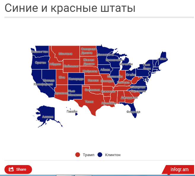 Традиционно демократов и, в частности, Хиллари Клинтон поддерживают в округе Колумбия, на Гавайях, в Мэриленде, Калифорнии, Массачусетсе. Республиканцы и Дональд Трамп наиболее популярны в Оклахоме, Алабаме, Теннесси, Луизиане, Техасе. В общем, поддержка демократов сконцентрирована на Востоке и Западе США, тогда как электорат республиканцев - штаты Центра и Юга.