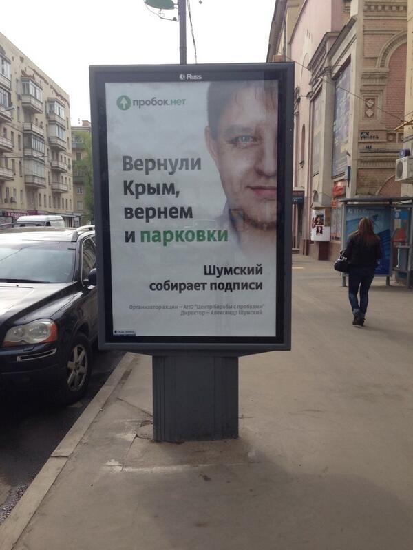 «Мне очень хочется, чтобы Probok.net появился в Киеве», – признавался некогда Шумский, но судьба распорядилась иначе. В феврале 2014 года он полетел в Крым поддерживать проведение референдума о присоединении к России. «Не могу сидеть в Москве, там русские в беде и им нужна помощь, – писал он. – Сегодня ночью смелые крымские ребята просто взяли и сделали то, что должны были – подняли российский флаг над зданием парламента Крыма». После этого рекламные щиты «Вернули Крым – вернем и парковки!» с улыбающимся Шумским уже не должны были никого удивить.