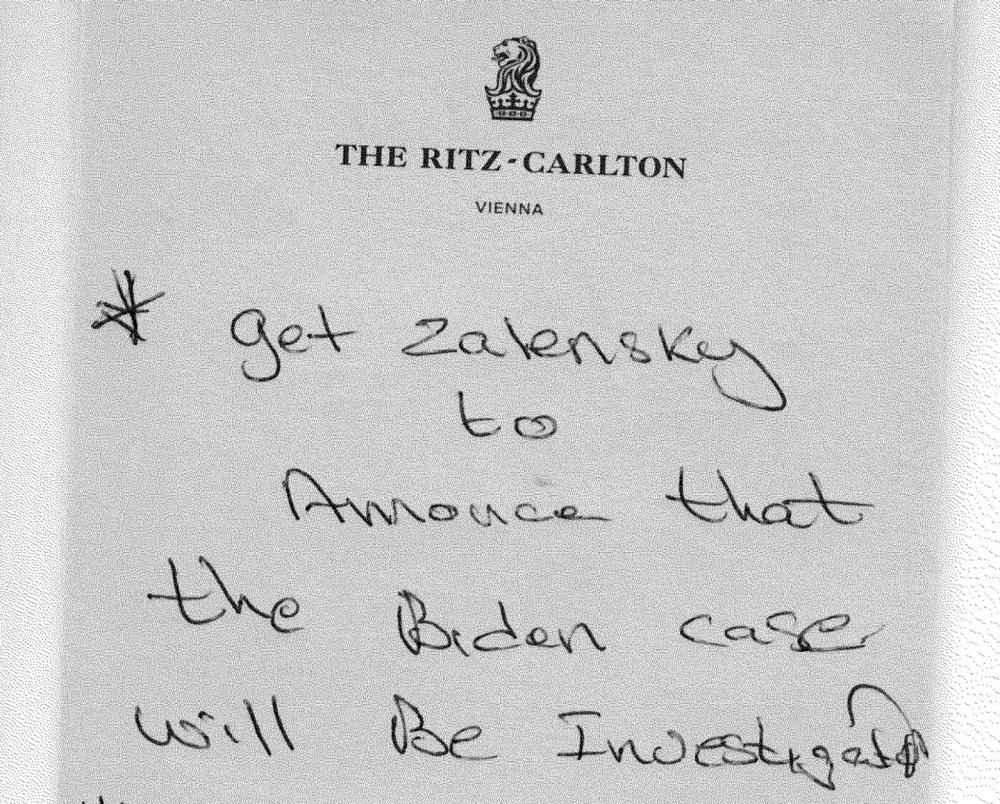 «Пусть Заленский объявит, что дело Байдена будет расследовано», - написано рукой Парнаса на канцелярских принадлежностях Венского отеля «Ритц-Карлтон».