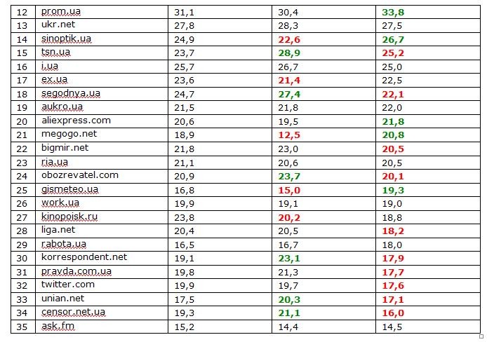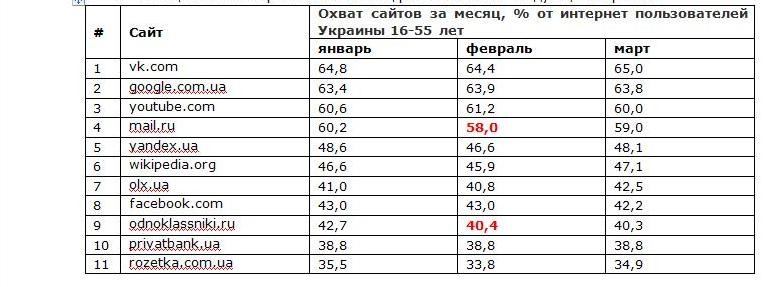 Также в феврале наблюдалось увеличение интереса к информационным сайтам, таким как tsn.ua, segodnya.ua, obozrevatel.com, korrespondent.net, pravda.com.ua, unian.net, censor.net.ua. Однако в марте охватные показатели этих сайтов вернулиcь к январским значениям.