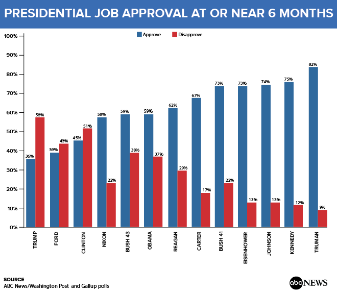 На прошедших выходных газета The Washington Post опубликовала результаты совместного с ABC News опроса поддержки Дональда Трампа, после шести месяцев его пребывания в должности главы государства. Согласно ним, рейтинг поддержки действующего президента худший из всех его предшественников.