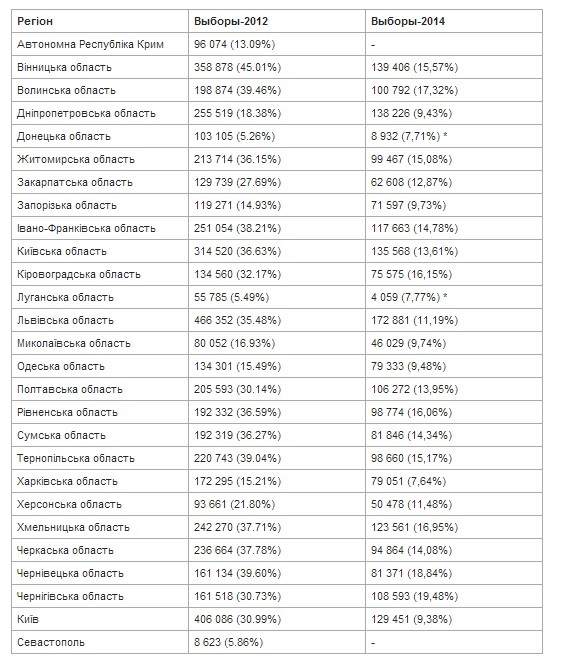 Якщо подивитися результати "Батьківщини" в 2012 та Юлії Тимошенко в 2014 в розрізі областей, то видно трикратне зменшення підтримки в базових регіонах, де раніше її приймали букетами троянд, а проводжали зі сльозами на очах.