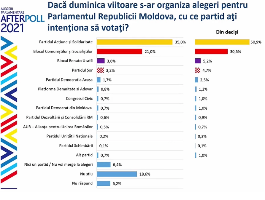 Згідно з відповідями всіх опитаних, включно із тими, хто не визначився, на першому місці - PAS, за яку проголосували б 35% опитаних. За блок комуністів і соціалістів висловив бажання проголосувати 21%. Решта учасників виборів не набрали 5% порога для партій або 7% для блоків, необхідних, щоб пройти в парламент.