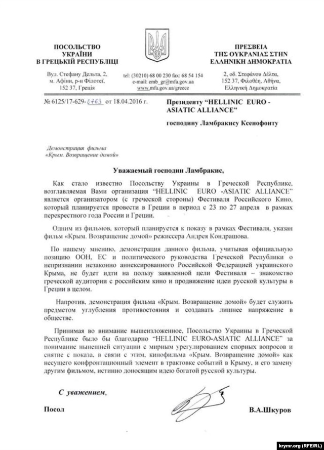 Посол України в Греції Володимир Шкуров 18 квітня звернувся до організатора фестивалю – президента грецько-євразійського союзуКсенофонта Ламбракіса із проханням зняти фільм із показу. У листі, який мають також Крим.Реалії, йдеться: «На нашу думку, демонстрація цього фільму, враховуючи офіційну позицію ООН, ЄС і політичного керівництва Грецької Республіки щодо невизнання незаконно анексованого Російською Федерацією українського Криму, не йтиме на користь заявленій меті фестивалю – знайомству грецької аудиторії з російським кіно і просування ідеї російської культури в Греції в цілому. Навпаки, це стане предметом поглиблення протистояння і створить зайву напруженість у суспільстві».