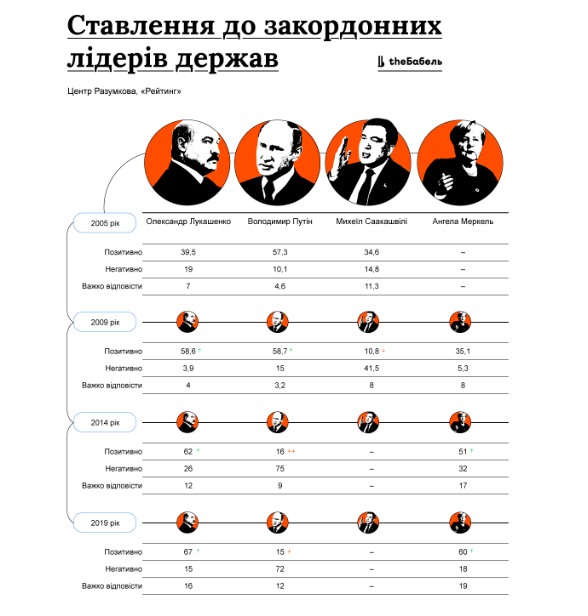 , у 2005 році був дуже популярний в Україні — до нього позитивно ставилися 34,6 відсотка. Але вже в 2009 кількість симпатиків Саакашвілі впала до 10,8 відсотка. В цей час Саакашвілі вже втрачав популярність у Грузії і це позначилося на його популярності в Україні. До Ангели Меркель ставилися тоді в удвічі краще, ніж до [президента Франції в 2009 році Ніколя] Саркозі. Хоча для України ці два лідери не відрізнялися, у Франції рейтинг Саркозі був нижче за рейтинг Меркель у Німеччині.