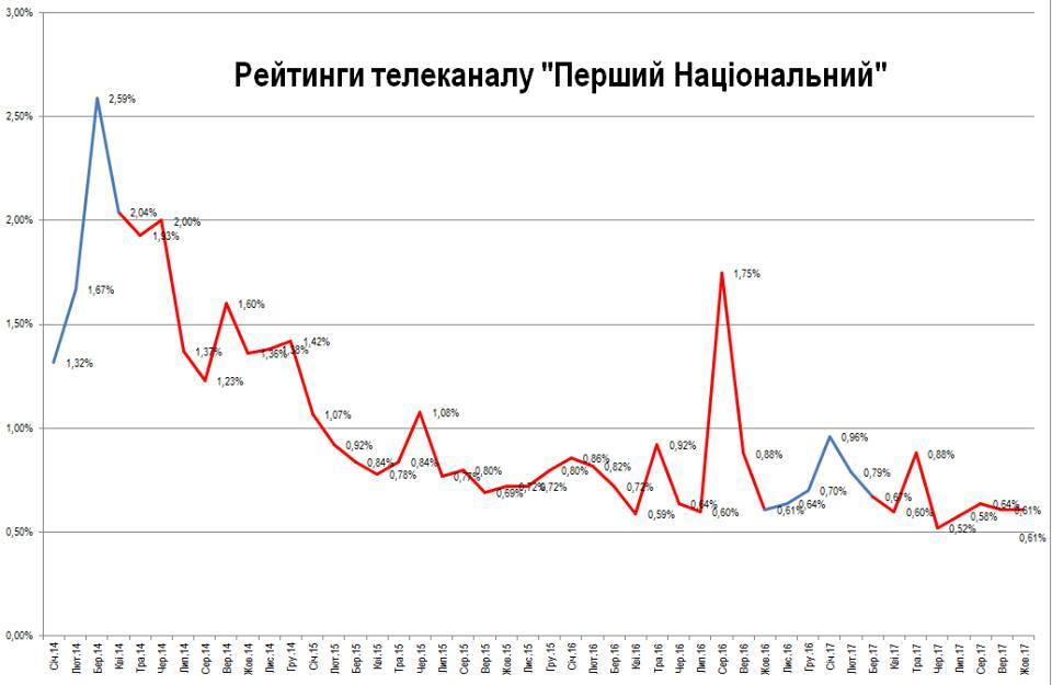 І що ми бачимо? А ми бачимо, що з часу приходу до влади на УТ-1 Зубара Аласанії рейтинг телеканалу впав з 2% до 0,5%, тобто в 4 рази. Державний телеканал, який транслюється по всій країні, в усіх кабельних мережах як обов'язковий, дивляться приблизно 0,5% населення, точніше 0,61%.
