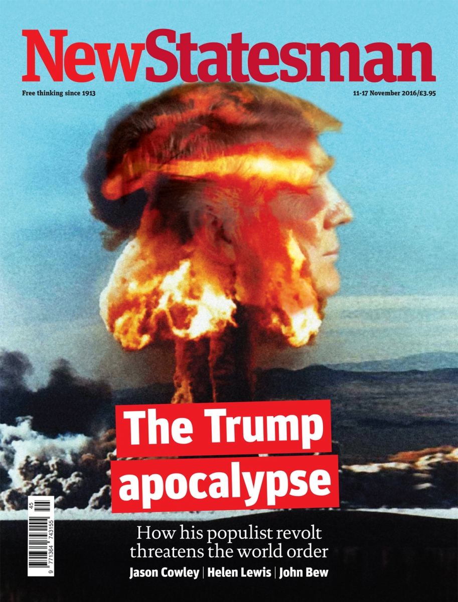 После победы Трампа еще одно британское издание New Statesman опубликовало на обложке своего выпуска за 11-17 ноября 2016 года лицо президента США, которое "срастается" с ядерным грибом.