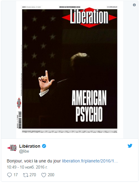 10 ноября 2016 года, после того, как Трамп 8 ноября выиграл выборы, французское издание Libération вышло с затемненным силуэтом Дональда Трампа на обложке. Видны только волосы и правая рука, пальцы которой изображают пистолет. Подпись – Американский психопат отсылает к известному одноименному роману Брета Истона Эллиса. Образцом успеха для главного героя романа – бизнесмена и по совместительству маньяка-убийцы Патрика Бэйтмена – является Трамп.
