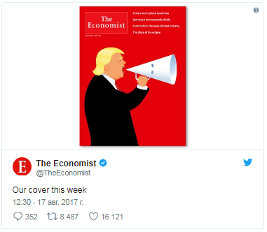 5 сентября 2017 года Трамп, точнее его знаменитая прическа, попала на обложку журнала The Economist. На обложке вертолет с подписью Trump накрывает Белый дом гигантской шевелюрой будущего президента, который тогда еще даже не выиграл праймериз.
