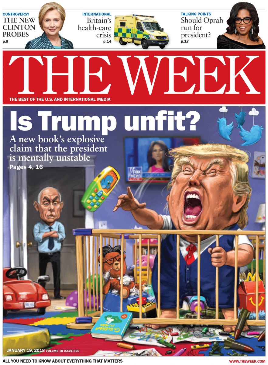 На обложке Трамп изображен в виде кабризного ребенка в манеже.