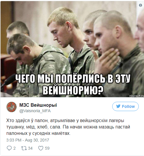 Сатиричний аккаунт у Twitter @Vaisnoria_MFA вже від імені Вейшнорії обіцяє «тушонку, мед, хліб та сало» тим білоруським солдатам, які здаються. Аккаунт також обіцяє не бомбити Мінськ.