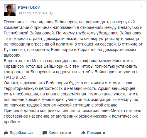 Історик-політолог Павел Усов на сторінці Facebook пише: «Вейшнорія є мирною демократичною країною, яка ніколи не виявляла агресії проти своїх сусідів. Ймовірно, Москва спровокувала конфлікт між Мінськом та Гірадісом (уявна столиця Вейшнорії), для того, щоб закріпити контроль над Білоруссю і не дозволити Вейшнорії вступити до НАТО та ЄС».