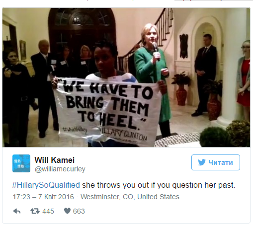Після цих слів прихильники колишнього держсекретаря почали постити в її підтримку хештег #HillarySoQualified (#ХілларіТакаКомпетентна), проте інші користувачі соцмереж відразу ж його висміяли