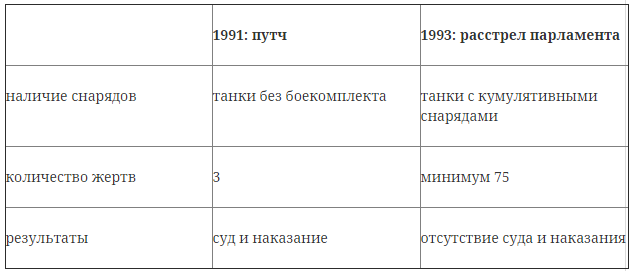И там, и там были танки на улицах. Во втором случае они даже стреляли с большим количеством жертв. Но пропагандистские танки в головах оказались на стороне Ельцина и в первом, и во втором случаях.