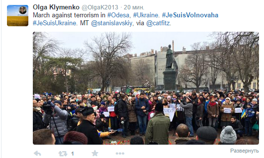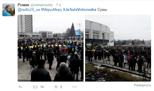 «Одночасно з мирним маршем у Києві ми закликаємо до маршу єдності та солідарності з Україною, де вже вбито терористами тисячі мирних жителів. 13 січня ще 12 цивільних загинули внаслідок обстрілу з боку терористів у Волновасі», – зазначено у Facebook на сторінці маршу в німецькому місті Гамбург.