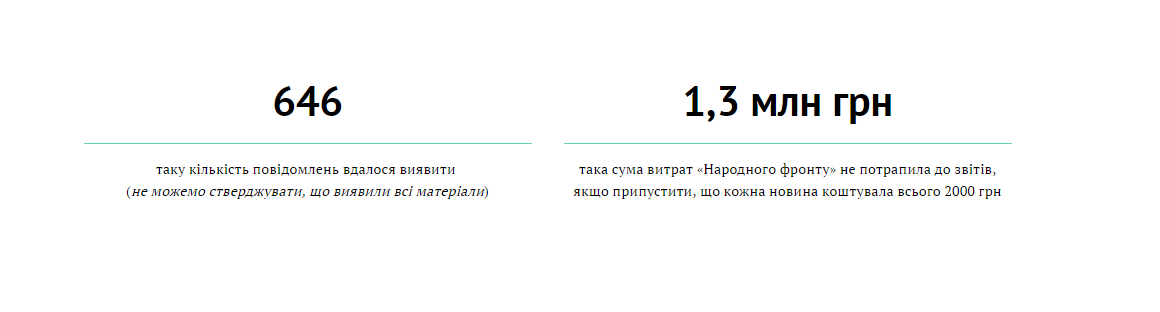 Як бачимо, відслідкувати платні новини можливо, від будь-якої партії. Не все, звісно, — у багатьох випадках проплачені публікації надто схожі на справжні новини, аби їх можна було чітко ідентифікувати. Ми свідомі того, що суттєва частина «джинси» залишилася поза нашою увагою і зараз. До того ж, ми не брали до уваги друковані видання, радіо та телебачення. Навряд чи «Народний фронт» витрачав кошти лише на один тип медіа, коли лише аудиторія телебачення суттєво перевищує аудиторію онлайн-ЗМІ. Важливо, що партія не лише приховала витрати на рекламу, а й залишила в тіні джерела фінансування та основних донорів.