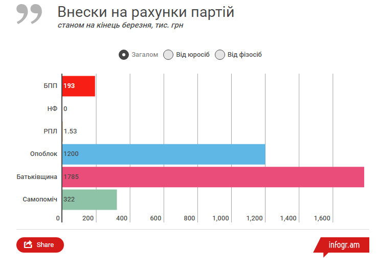 Єдиними, чиї партійні рахунки поповнювались виключно фізичними особами стали "Самопоміч" та "Батьківщина". Партія Садового зуміла залучити понад 320 тисяч гривень, а партія Тимошенко – аж 1,7 мільйона.