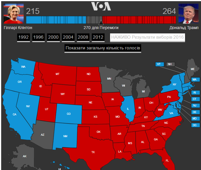 Інтерактивна карта, надана Voice of America, дозволяє порівнювати результати голосування у 2016 році та у попередніх роках.
