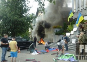 Активісти прийшли під будівлю центрального офісу телеканалу Інтер на вулиці Дмитрівській у Києві.