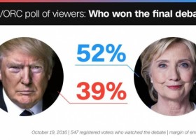 Кандидат на пост президента США від Демократичної партії Хілларі Клінтон виграла треті дебати, згідно з опитуванням глядачів, проведеним CNN.