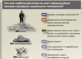 54% респондентів вважають, що новини формують вказівки олігархів, 36% ключовим вважають вплив неформальних розпоряджень представників органів державної влади, а 29% - політиків, які замовляють приховану рекламу в ефір.
