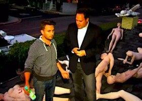 Житель американского штата Калифорния разместил на крыше своего дома необычную инсталляцию — полсотни полноростовых манекенов человека, лежащих вокруг таблички «50 мертвых людей».