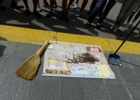 Учасники акції принесли під стіни НБУ колорадських жуків та вручили представникам банку віник та совок. «Це символічна дія, з вимогою зачистити територію України від «коло радів» та їх спонсорів.