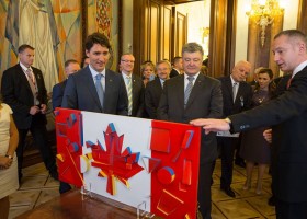 В Адміністрації президента підготували подарунок для прем'єра Канади Джастіна Трюдо, який перебуває зараз в Києві з офіційним візитом: йому презентували прапор Канади, виконаний в концепції українського авангарду.