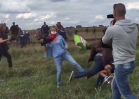 У мережі з’явилось відео, на якому видно, як операторка угоського каналу N1TV Петра Ласло (Petra László) підставляє підніжку чоловіку з дитиною на руках, через що той падає.