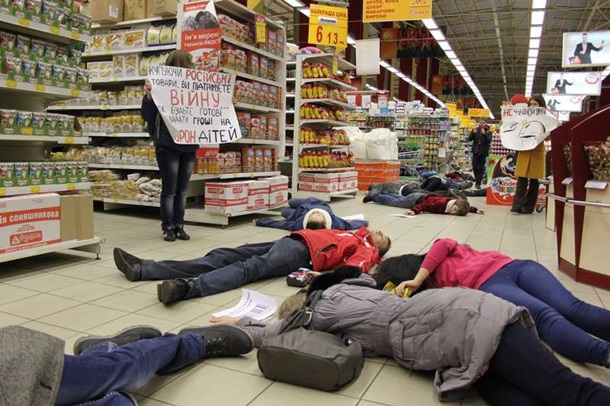 В киевских супермаркетах состоялся ряд флешмобов "Русское убивает!"