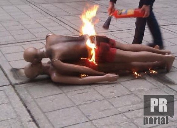 В ходе акции прямо во дворе здания Верховной Рады, где сегодня состоится сессия, уложили двух манекенов, символизирующих однополую любовь, и подожгли.